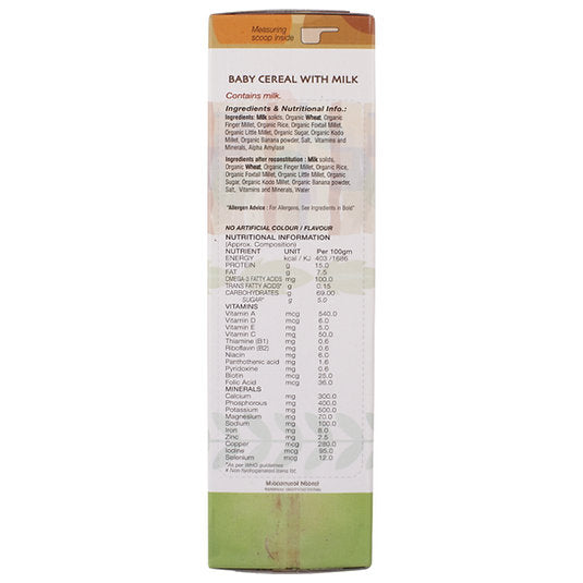 Milk Solids, Organic Wheat, Organic Finger Millet, Organic Rice, Organic Foxtail Millet, Organic Little Millet, Organic Sugar, Organic Kodo Millet, Organic Banana Powder, Salt, Vitamins and Minerals, Alpha Amylase.